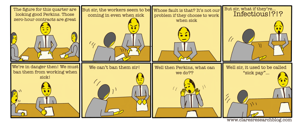 It seems bizarre that there are so few writing resources for law students. Ironically, the resources that do exist are usually in the form of books… meaning that if you want to improve your writing, you need to wade through a lot of text first. What if we could convey the main concepts visually?Visual approaches aren’t only for those who avoid large volumes of text. If we want to interrogate the core concepts in any research or scholarship, we probably ought to address how those concepts are framed. And as my research shows, it’s almost impossible to challenge frames from within. Visual and acoustic approaches can allow us to step outside of linguistic frames (and their intrinsic values and interests) and innovatively rethink how we do, talk, and think about legal and economic phemomena.Facts bounce off. They bounce off frames, whether these are correct or not. Once those mental models are in place, no amount of factual retelling will change this. We see this with debates about vaccinations and climate change. The answer? Reframing the debate. Coronavirus: The Workers’ Latest Bargaining Tool for rights in the workplace. Sick pay, holiday pay, maternity and paternity pay have all been rolled back in recent years, and the rise of precarious working practices and “self-employed” status through zero hours contracts has been one aspect of this. The virus has the unique ability to place bargaining power back in the hands of workers. If infection rates are to be reduced, we cannot continue to turn a blind eye to workers being forced to work when sick.